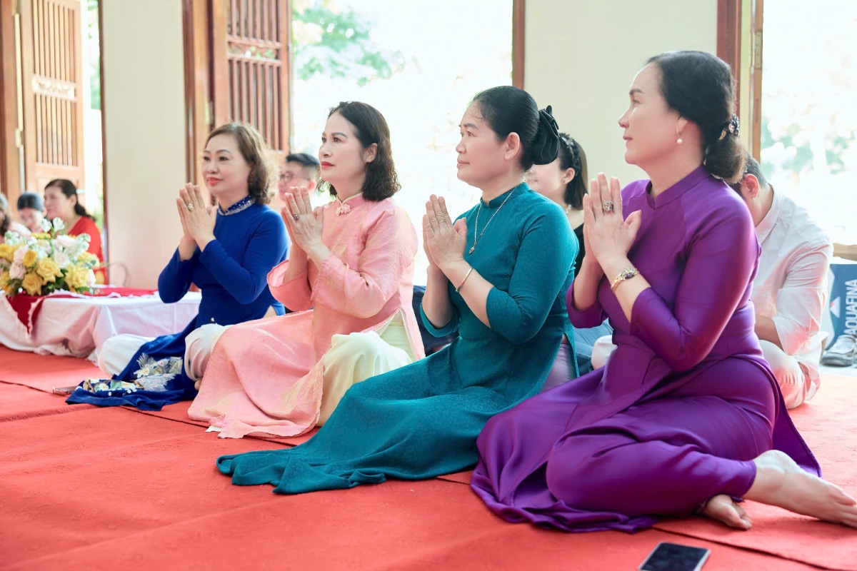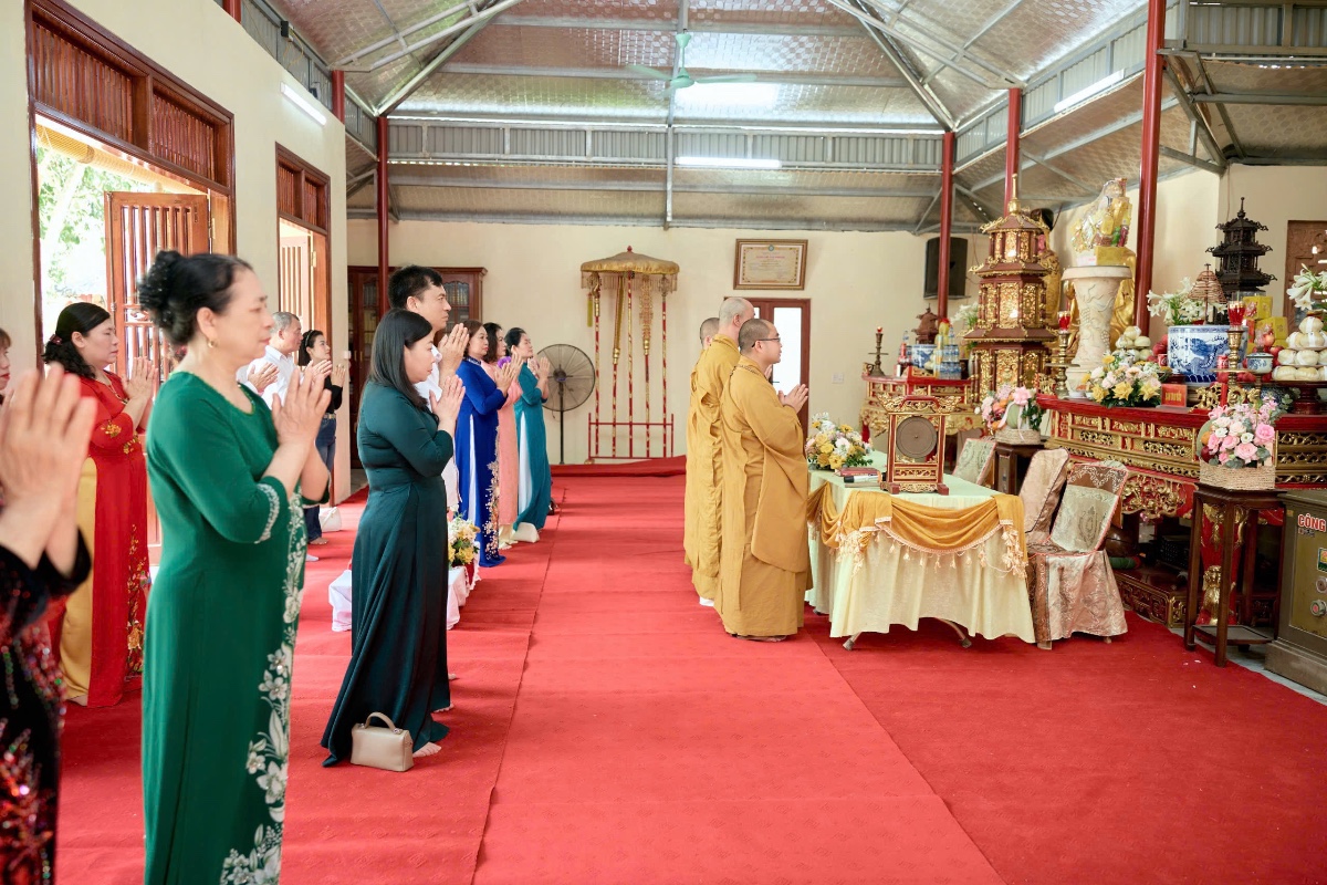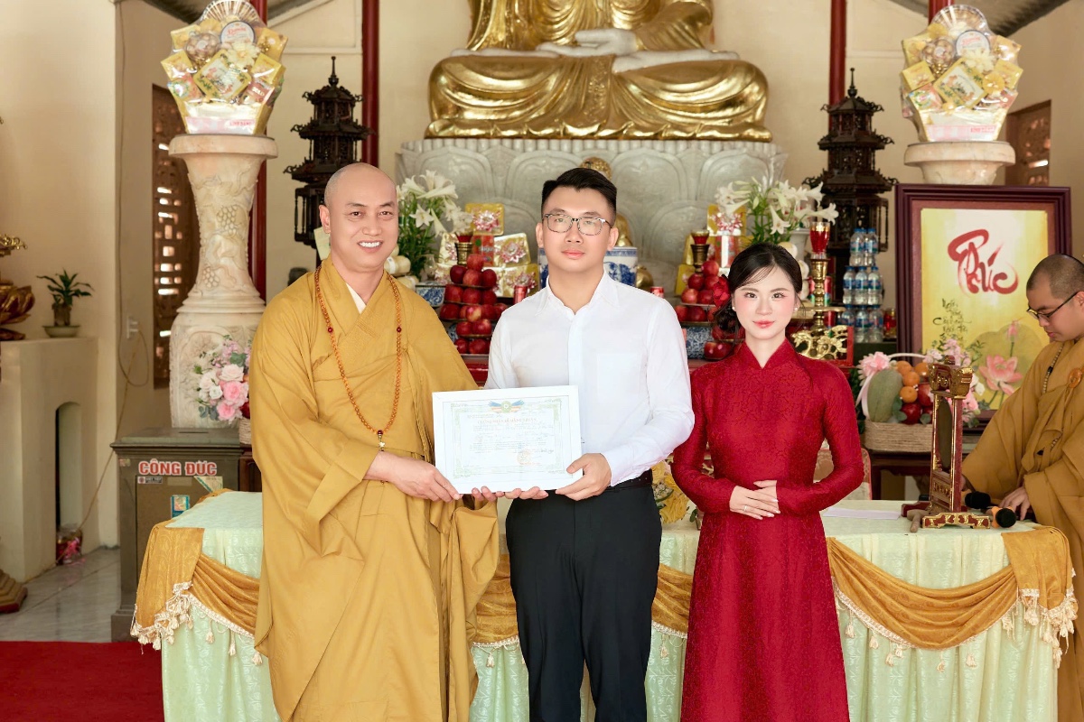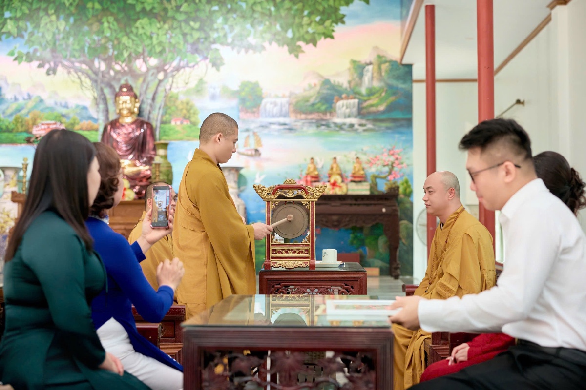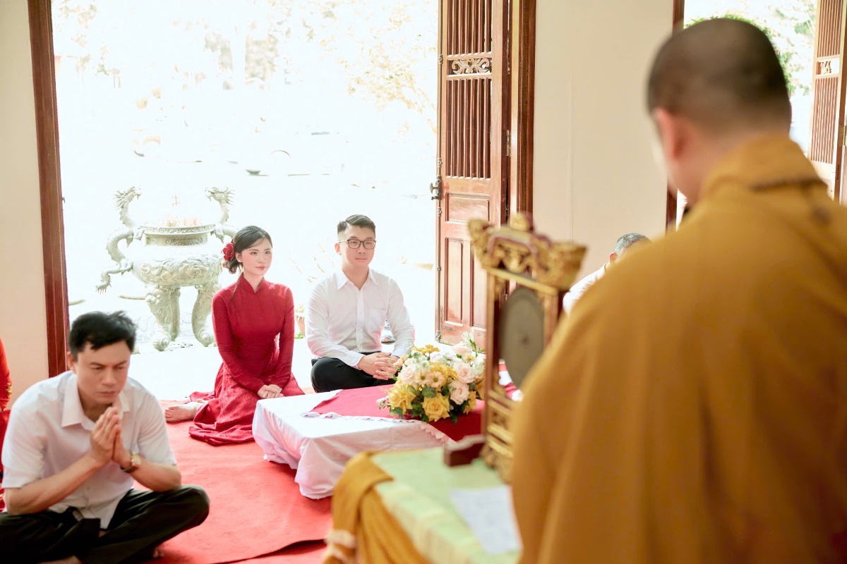Tại chính điện, chư Tôn đức đã niêm hương bạch Phật, hướng dẫn đôi bạn trẻ cùng hai bên gia đình dâng hương lễ Phật, tụng kinh cầu an, cầu nguyện cho đời sống hôn nhân được hạnh phúc, bền lâu. Đây là nghi thức quan trọng, giúp đôi vợ chồng trẻ khởi đầu cuộc sống chung trong sự tỉnh thức và nương tựa Tam Bảo.